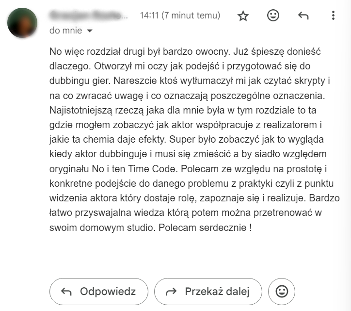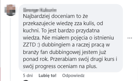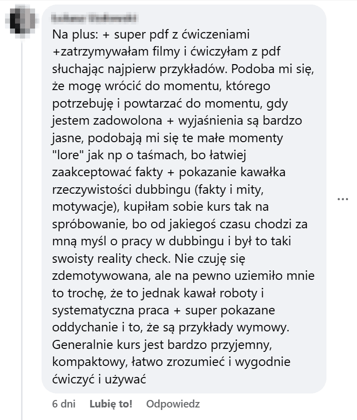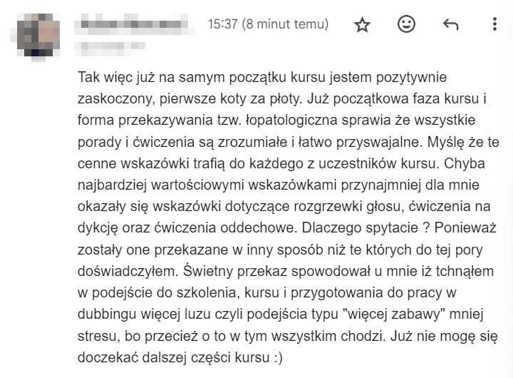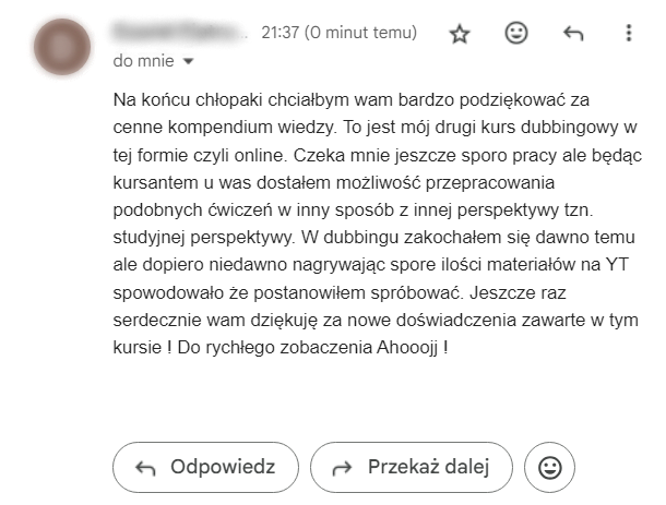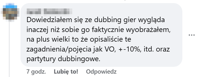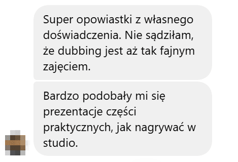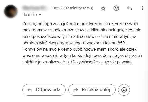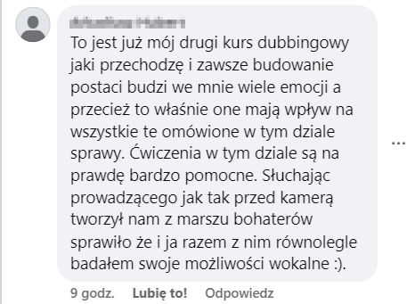 dziesiątki warsztatów dubbingowych, poznając wszystkie typowe błędy początkujących. Współtworzyłem ten kurs modelując go tak, abyś mógł szybko stanąć za mikrofonem i poczuć się jak profesjonalista. Jeśli już dubbingujesz, pomoże Ci on znacząco poprawić umiejętności. Dołącz do nas i rozwijaj się szybciej i łatwiej!